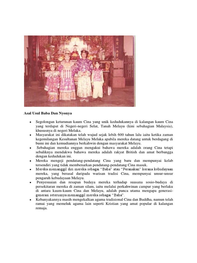 Kalau afrika, asal namanya berawal dari bangsa romawi, nih. Namun, terdapat banyak versi yang diceritakan dalam usaha untuk mengesan asal usul dan identiti kebudayaan masyarakat hibrid unik ini yang disebut peranakan. Baba nyonya is one of the unique tribe or community in malaysia because of their practiced lifestyle that harmonically combine both malay and chinese cultures. Mereka tidak memeluk agama islam. Learn vocabulary, terms and more with flashcards, games and other study tools.